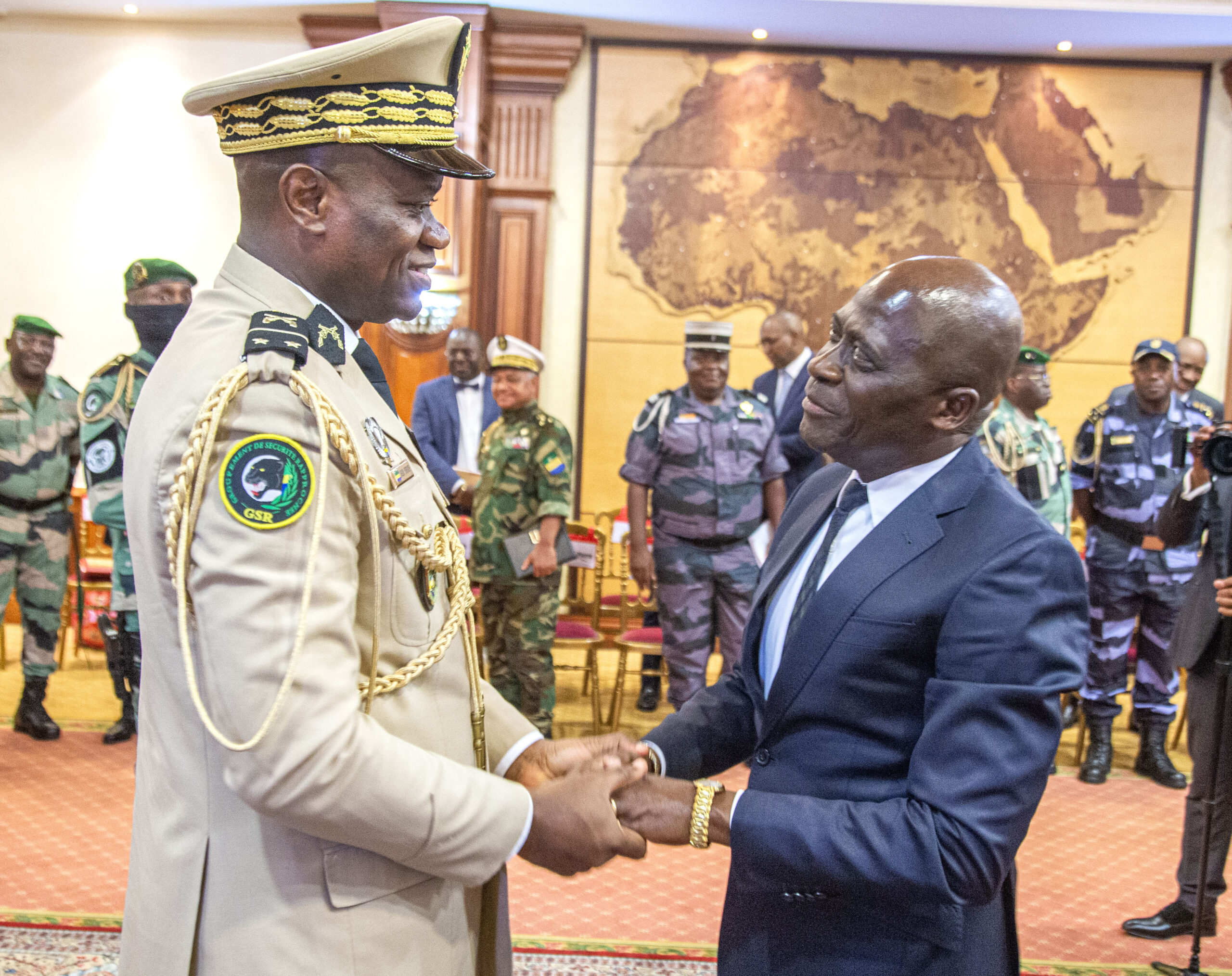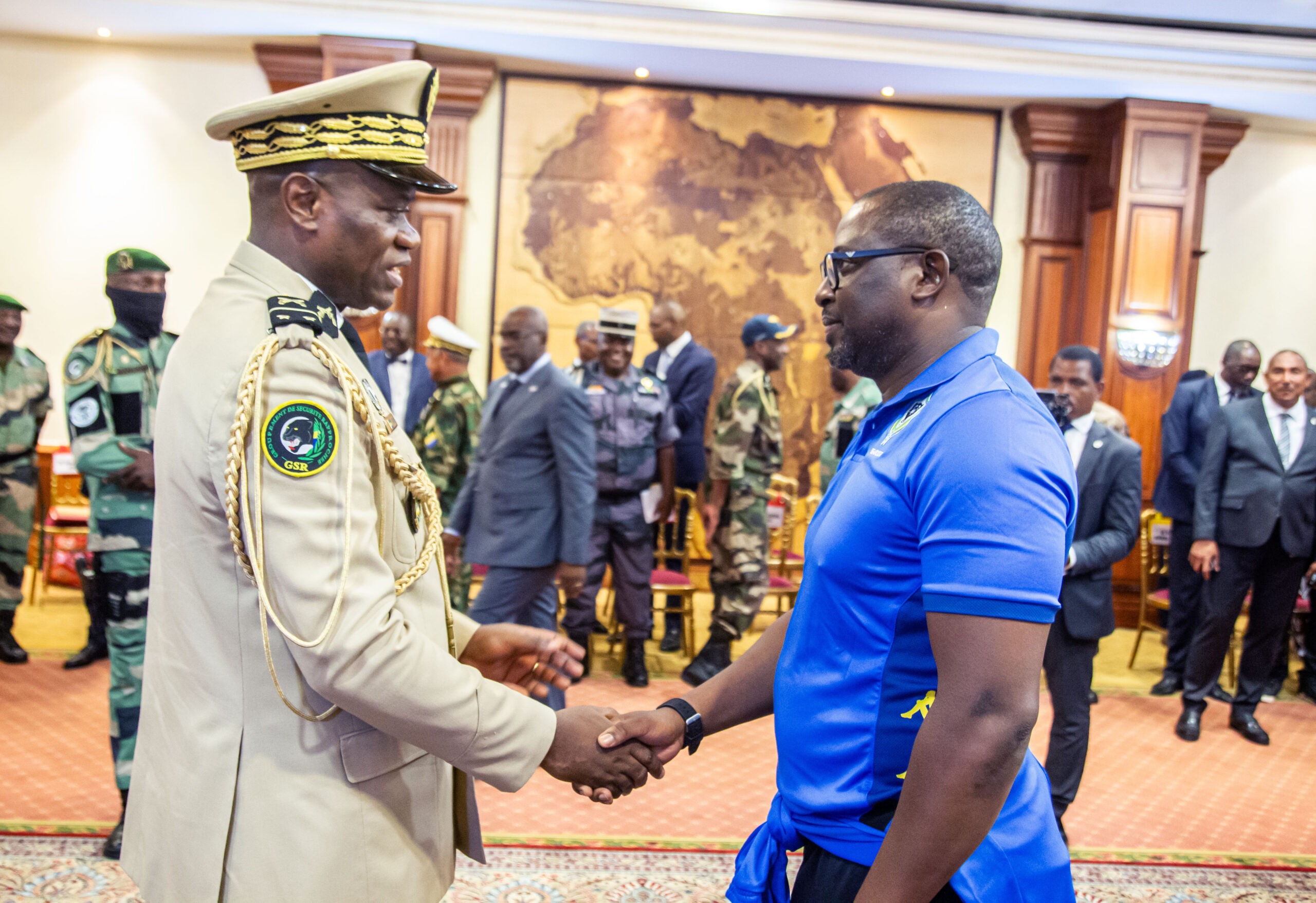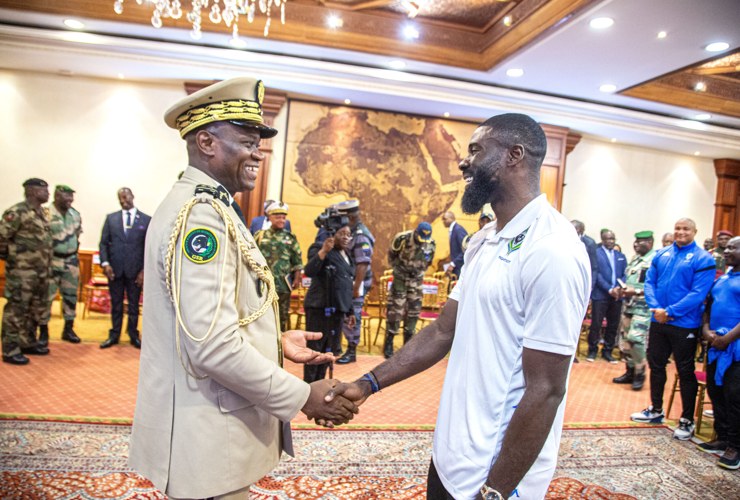 Brice Clotaire Oligui Nguema saluant le président de la Fédération Gabonaise de Football (FEGAFOOT) lors de sa rencontre avec les joueurs de l’équipe nationale. © Communication présidentielle.