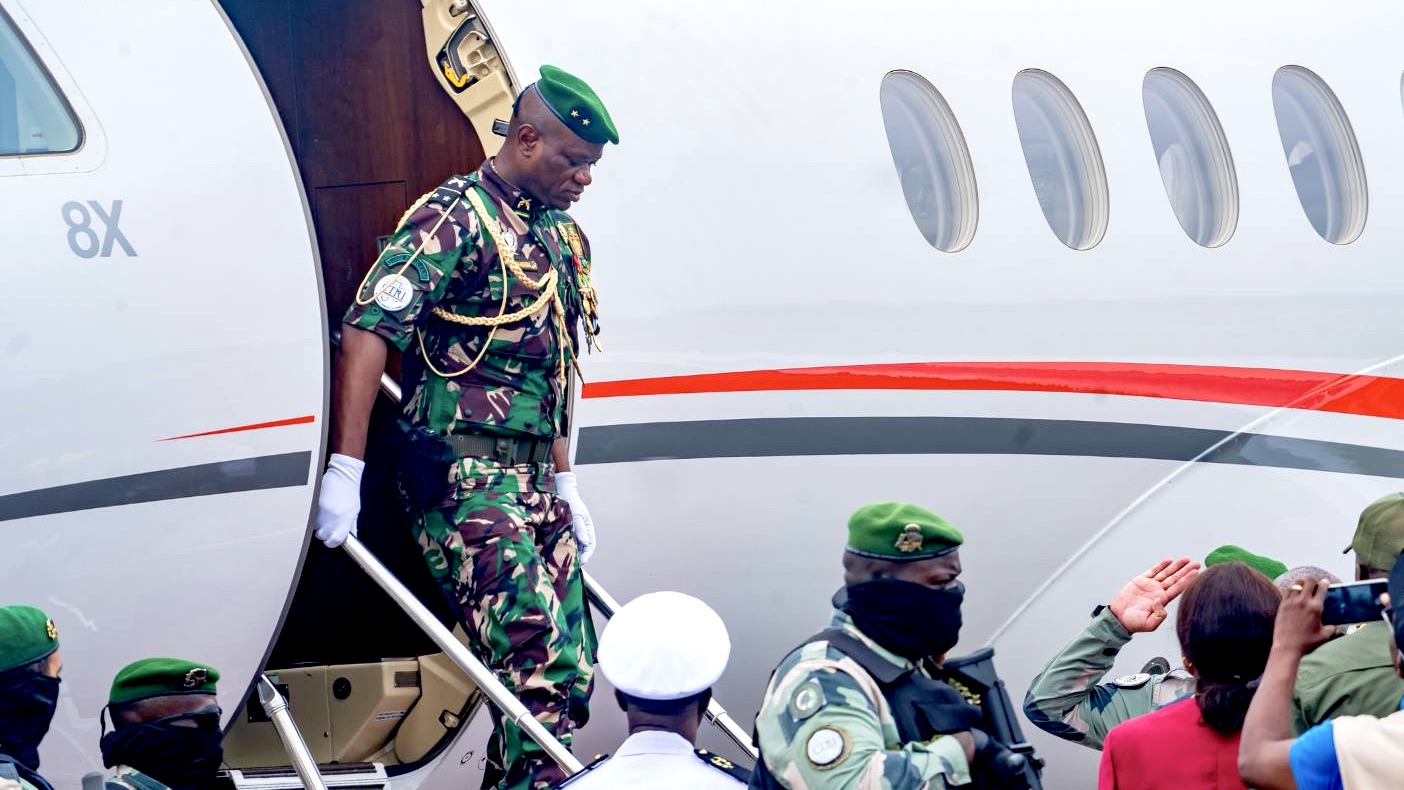 Le président de la transition, Brice Clotaire Oligui Nguema descendant d'un avion. © ANPN.