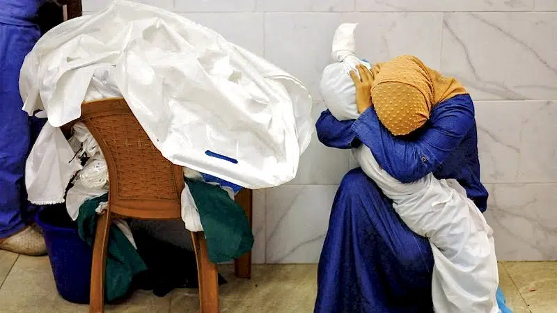 Image d'une femme palestinienne berçant le corps de sa nièce de cinq ans dans la bande de Gaza. © Mohammed Salem / Reuters.